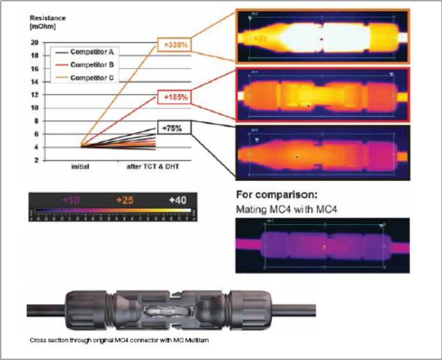 “類MC4”出于市場(chǎng)原因,宣稱可與MC4互插。盡管外形上,看似完成了連接,但隱形的安全風(fēng)險(xiǎn)已然發(fā)生。不同廠家連接器在規(guī)格、尺寸和公差等方面并不一致,所以根本無法100%匹配。倘若強(qiáng)行匹配,會(huì)導(dǎo)致溫度升高、接觸電阻變大和IP等級(jí)無法保證的問題,嚴(yán)重影響電站的發(fā)電效率和安全。