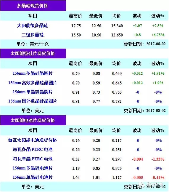 本周國(guó)內(nèi)多晶硅價(jià)格小幅上漲,太陽能一級(jí)致密料報(bào)價(jià)區(qū)間在12.4-13.2萬元/噸,均價(jià)12.92萬元/噸,周環(huán)比上漲0.54%。一級(jí)致密料成交價(jià)區(qū)間在12.2-13.0萬元/噸,均價(jià)為12.77萬元/噸,周環(huán)比上漲0.63%。本周進(jìn)口多晶硅主流報(bào)價(jià)12.50-17.75美元/千克,均價(jià)為15.34美元/千克,周均價(jià)環(huán)比上漲7.5%;156mm多晶硅晶圓報(bào)價(jià)0.58-0.70美元/片,均價(jià)為0.640美元/片,周環(huán)比上漲1.91%;156mm多晶硅電池片報(bào)價(jià)為0.85-1.19美元/片,均價(jià)0.973美元/片維持不變;晶硅太陽能電池組件報(bào)價(jià)在0.29-0.41美元/瓦,均價(jià)0.327美元/瓦維持不變。
