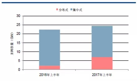 根據(jù)能源局?jǐn)?shù)據(jù),2017年上半年,全國(guó)光伏發(fā)電新增裝機(jī)達(dá)到24.4GW,同比增加9%,超過(guò)去年的上半年的高點(diǎn),遠(yuǎn)遠(yuǎn)好于業(yè)內(nèi)年初的預(yù)期。今年第一季度分布式光伏新增裝機(jī)2.43GW,與2016年同期相比增長(zhǎng)151%,而集中式電站降23%。進(jìn)入搶裝期的第二季度,業(yè)內(nèi)人士統(tǒng)計(jì),分布式光伏在四、五月的新增裝機(jī)占比分別達(dá)到44.7%和40.4%,前5個(gè)月新增裝機(jī)規(guī)模超4GW,不到半年時(shí)間完成了2016年全年的分布式光伏增長(zhǎng)量,且6月仍有成倍增長(zhǎng)。