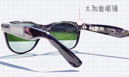 德國(guó)科學(xué)家發(fā)明了一款基于半透明有機(jī)太陽能電池材料的眼鏡,可以利用太陽能為手機(jī)充電。這款太陽能眼鏡的鏡片與普通鏡片相似,厚度為1.6毫米,重6克。眼鏡上有一個(gè)微處理器和兩個(gè)電量顯示器,能夠顯示太陽光照強(qiáng)度以及周圍環(huán)境溫度。