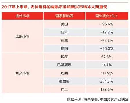 海外市場:兩處明顯變化值得注意。一是從總體上來看,無論是硅片、電池片還是組件,中國企業(yè)的出口量都維持著高速增長,然而其出口額卻明顯同比下降,這說明光伏組件的出口是在以量補價,平均外銷價格要比去年低的多。二是從局部來看,國際市場結(jié)構(gòu)出現(xiàn)了明顯的變化,其中包括美國、德國、日本在內(nèi)的成熟市場出口額下滑明顯,而包括印度、巴西、墨西哥在內(nèi)的新興市場則出現(xiàn)了爆發(fā)式增長。這主要是由于中國企業(yè)已經(jīng)有不少在成熟市場國家投資建廠,出貨量不再走海關(guān)統(tǒng)計口徑的原因。