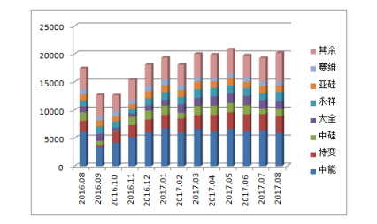圖2 2016年8月-2017年8月國內(nèi)多晶硅分企業(yè)產(chǎn)量 單位:噸 來源:硅業(yè)分會