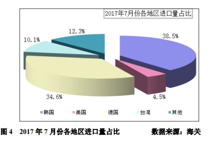分國別來看:2017年7月份,自韓、德、美、中國臺灣這四個地區(qū)進口量12025噸,占總進口量的87.7%,進口量占比分別為38.5%、34.6%、4.5%、10.1%,韓國進口量仍居首位,德國進口量占比大幅增加。分貿(mào)易方式來看:2017年7月份按加工貿(mào)易方式進口多晶硅占比22.8%,其中自美國按加工貿(mào)易方式進口占比為50.9%,100%通過保稅區(qū)倉儲轉(zhuǎn)口方式進入國內(nèi)。