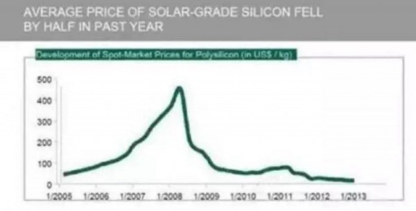 2005年-2013年全球太陽(yáng)能級(jí)多晶硅價(jià)格走勢(shì)圖