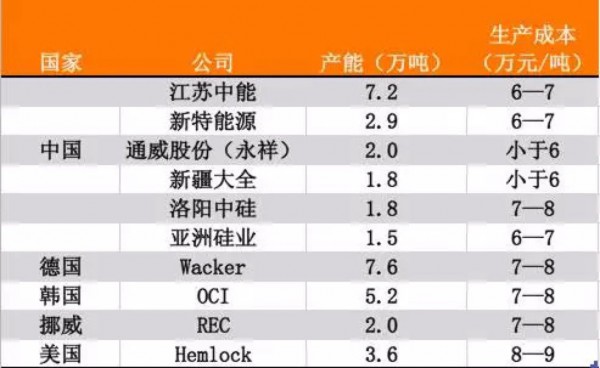 2016年全球多晶硅主要廠商產(chǎn)能情況
