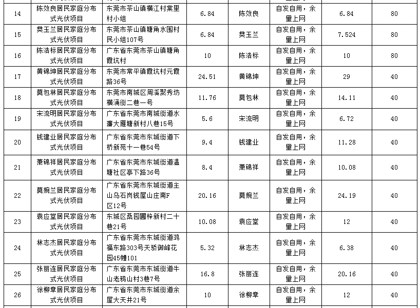 廣東東莞224個家庭分布式光伏項目備案信息表