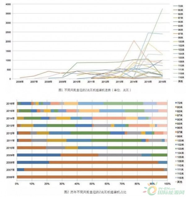 圖1 和圖2 分別為2006 年—2016 年,我國(guó)不同風(fēng)輪直徑的2 兆瓦機(jī)組新增裝機(jī)以及占比情況。從中可以看出,歷年有新增裝機(jī)的2 兆瓦機(jī)組的風(fēng)輪直徑類(lèi)型日趨豐富,2016 年達(dá)到24 種之多。