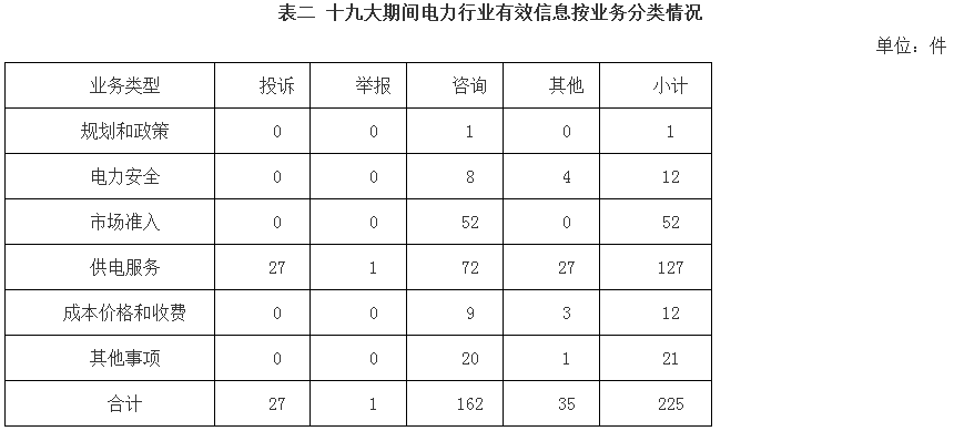 280件有效信息中,電力行業(yè)類225件,占80.36%;新能源和可再生能源類23件,占8.21%;其他事項(xiàng)32件,占11.43%。(十九大期間電力行業(yè)有效信息按業(yè)務(wù)分類情況,見表二)