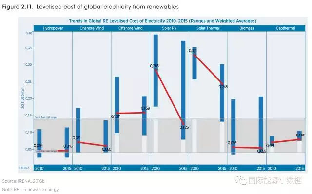 根據(jù)國際可再生能源署的數(shù)據(jù),2010-2015年各類可再生能源全生命周期平準(zhǔn)成本(美元/千瓦時)走向如下: