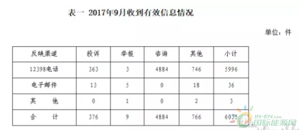通報指出,2017年9月,國家能源局12398熱線(以下簡稱12398熱線)共收到有效信息6035件,環(huán)比減少19.64%。