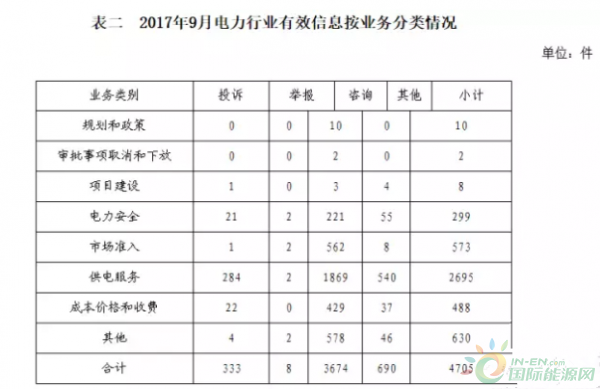 2017年9月收到的有效信息中,電力行業(yè)類4705件,占77.96%;新能源和可再生能源行業(yè)類697件,占11.55%;石油天然氣行業(yè)類72件,占1.19%;煤炭行業(yè)類3件,占0.05%;其他事項558件,占9.25%。