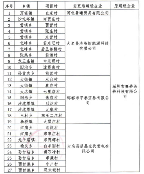 同意大名縣2016年村級光伏扶貧電站項目建設(shè)單位由原深圳市賽特萊特科技有限公司變更為河北署曦貿(mào)易有限公司、大名縣洛峰新能源科技有限公司、邯鄲市平泰貿(mào)易有限公司、大名縣燚晶光伏發(fā)電有限公司(詳見附件),并承擔后續(xù)扶貧工作,其他內(nèi)容不變。