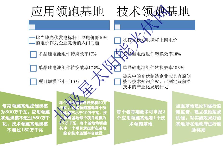 應(yīng)用領(lǐng)跑基地要求多晶硅、單晶硅電池組件轉(zhuǎn)換效率分別為17%、17.8%,技術(shù)領(lǐng)跑基地要求多晶硅、單晶硅電池組件轉(zhuǎn)換效率分別為18%、18.9%。