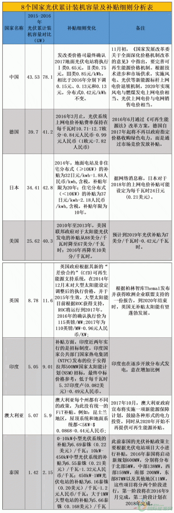2015-2016累計裝機容量位居前三名的是:中國、德國、日本;其次是美國、英國、印度、澳大利亞、泰國。