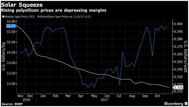 根據(jù)位于加拿大太陽能公司Canadian Solar的數(shù)據(jù)顯示,這兩起事件導(dǎo)致多晶硅短缺,中國多晶硅價格在過去四個月中從每公斤14美元上漲到19美元。