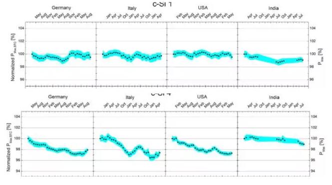 穩(wěn)定性相對慘淡一點點,但還不是不可知。一般來說熱退火效應可以提升一點點性能,直到亞穩(wěn)態(tài)結束。這里從溫差比較大的德國和意大利能看出明顯的性能周期(夏天好一點,冬天差一點),而暴熱的美國亞利桑那大沙漠和印度欽奈直接加速老化,迅速結束了亞穩(wěn)態(tài),直接開始線性衰減了。