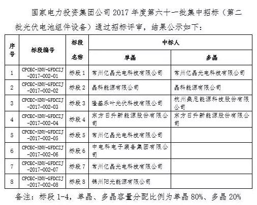 國(guó)家電投2017度第六十一批集中招標(biāo)3.4GW組件、3.75GW逆變器中標(biāo)結(jié)果公示