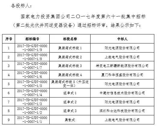 12月8日,國(guó)家電投公示2017度第六十一批集中招標(biāo)第二批光伏組件、并網(wǎng)逆變器中標(biāo)結(jié)果。