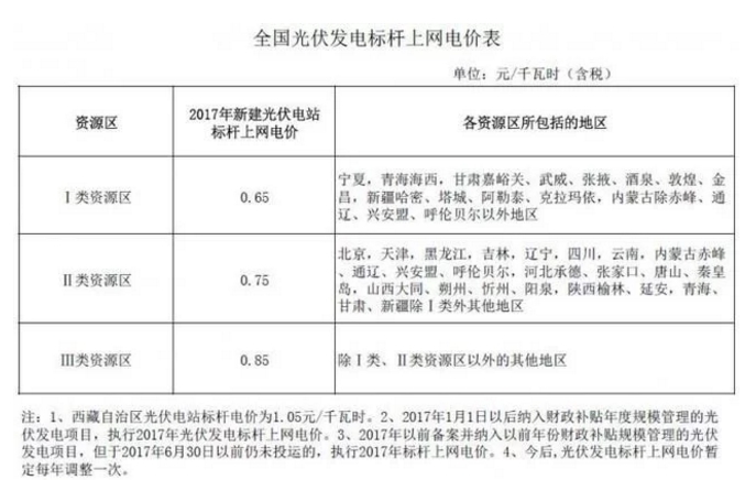 國家發(fā)展改革委于2017年12月22號下發(fā)《關(guān)于2018年光伏發(fā)電項目價格政策的通知》,要求降低2018年1月1日之后投運的光伏電站標(biāo)桿上網(wǎng)電價,Ⅰ類、Ⅱ類、Ⅲ類資源區(qū)標(biāo)桿上網(wǎng)電價分別調(diào)整為每千瓦時0.55元、0.65元、0.75元(含稅);村級光伏扶貧電站上網(wǎng)電價分別為0.65元、0.75元、0.85元;通知規(guī)定,2018年1月1日以后投運的、采用“自發(fā)自用、余量上網(wǎng)”模式的分布式光伏發(fā)電項目,全電量度電補貼標(biāo)準(zhǔn)降低0.05元,即補貼標(biāo)準(zhǔn)調(diào)整為每千瓦時0.37元(含稅)。采用“全額上網(wǎng)”模式的分布式光伏發(fā)電項目按所在資源區(qū)光伏電站價格執(zhí)行。