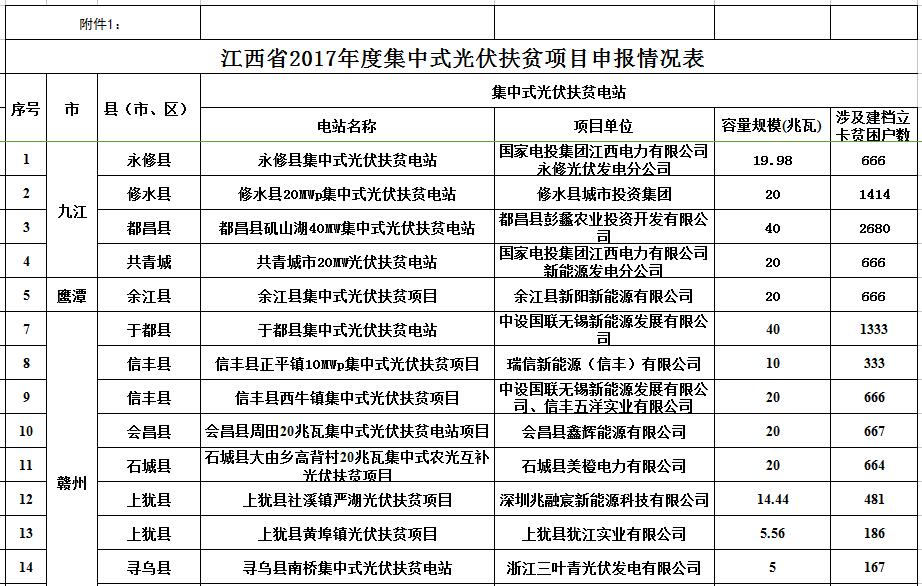 江西省2017年740.73MW集中式光伏扶貧電站申報(bào)情況
