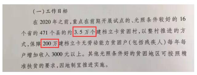 下圖為《關(guān)于實(shí)施光伏發(fā)電扶貧工作的意見(jiàn)》文件,文中表明,在2020年之前,重點(diǎn)在16個(gè)省的471個(gè)縣的約3.5萬(wàn)個(gè)建檔立卡貧困村,保障200萬(wàn)建檔立卡無(wú)勞動(dòng)力貧困戶每年每戶增收3000元以上。