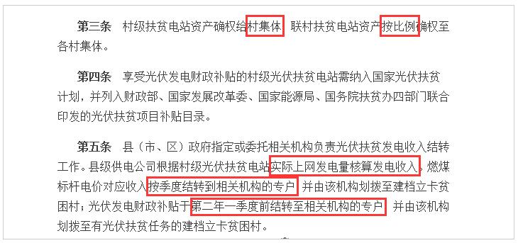 2017年12月21日,扶貧辦發(fā)布了《村級(jí)光伏扶貧電站收益分配管理辦法》的通知,通知對(duì)村級(jí)扶貧電站的產(chǎn)權(quán)以及收益結(jié)轉(zhuǎn)辦法進(jìn)行了規(guī)范,指出,電站產(chǎn)權(quán)歸屬于村集體,所得收益分為“燃煤標(biāo)桿電價(jià)”與“光伏發(fā)電財(cái)政補(bǔ)貼”兩類進(jìn)行分次發(fā)放,前者以季度為周期進(jìn)行結(jié)轉(zhuǎn),后者第二年第一季度結(jié)轉(zhuǎn)。