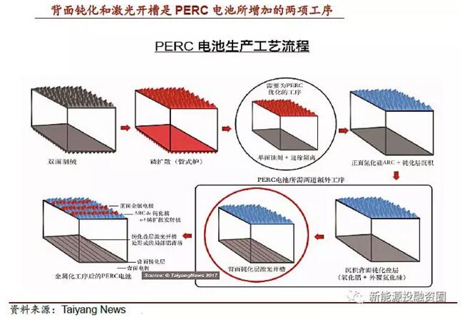 新增兩種設(shè)備,效率提升一個百分點:PERC 電池,全稱為鈍化發(fā)射極和背面電池,其電池結(jié)構(gòu)是從常規(guī)鋁背場電池(BSF)結(jié)構(gòu)自然衍生而來,通過在電池背面附上介質(zhì)鈍化層,能夠大大減少這種光電損失,這就是PERC 電池的工作原理。PERC 通過對原有電池生產(chǎn)線增設(shè)兩種不同的設(shè)備,實現(xiàn)電池效率一個百分點的提高,同時其生產(chǎn)成本較之常規(guī)電池又能保持競爭性。