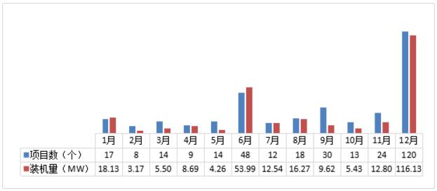 從各月份并網(wǎng)情況上看,如圖3所示,2017年6月和12月新增并網(wǎng)非戶用分布式光伏項(xiàng)目數(shù)量和裝機(jī)容量驟增,達(dá)到兩個(gè)小高峰,尤其是12月新增項(xiàng)目數(shù)量和裝機(jī)容量超過(guò)全年的三分之一。