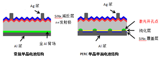 和常規(guī)單晶電池工藝相比,PERC單晶電池主要增加了背面鈍化、背面SiNx膜沉積和激光打孔三道工藝。其中激光打孔工藝是利用一定脈沖寬度的激光在去除部分覆蓋在電池背面的鈍化層和SiNx覆蓋層,以使絲網(wǎng)印刷的鋁漿可以與電池背面的硅片形成有效接觸,從而使光生電流可以通過Al層導出。因Al漿無法穿透SiNx層,其余未被激光去除的鈍化層被覆蓋在其上方的SiNx覆蓋層保護,發(fā)揮降低表面復合速率,提升效率的作用。