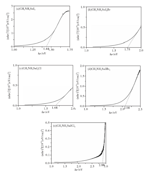 圖4是不同成分的鈣鈦礦薄膜的的關系曲線。由圖4(a)可見,CH3NH3SnI3成分的薄膜禁帶寬度最小,為1.44eV。摻雜部分Br-與Cl-后,如圖4(b)、(c)所示,CH3NH3SnI2Br和CH3NH3SnI2Cl鈣鈦礦薄膜的禁帶寬度增大,分別為1.75eV和1.68eV,這是由于Br-與Cl-的引入導致鈣鈦礦結構的晶格變小,并且電離度增加,從而導致帶隙變寬。而當Br-與Cl-的摻雜量增多,如圖4(d)、(e)所示,CH3NH3SnIBr2和CH3NH3SnICl2鈣鈦礦薄膜的禁帶寬度進一步增大,分別為2.08eV和2.88eV圖4 不同成分的鈣鈦礦薄膜的的關系曲線圖