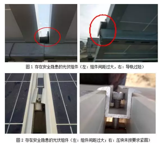 壓塊一般采用M6的內(nèi)六角螺栓(螺栓進(jìn)行熱浸鋅處理),和配套的螺母,再配彈簧墊圈和平墊圈將光伏電池組件固定在支架檁條(支架為C型鋼)上。但是由于施工階段,由于導(dǎo)軌長(zhǎng)度未達(dá)到設(shè)計(jì)要求、支架傾斜不平、組件相鄰間距過(guò)大,造成螺栓未緊固到位等問(wèn)題,帶來(lái)了潛在的安全隱患,如圖1和圖2所示。
