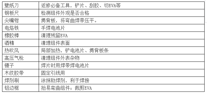 2)對于虛焊片,若電池片背面虛焊則直接用烙鐵手工焊好即可,若電池片正面虛焊則需要把虛焊的電池片拆下來,在模板上用烙鐵焊好,再焊回原處。(注意:虛焊一般情況下會出現(xiàn)在電池片正反兩面,需返修操作員仔細檢查。)