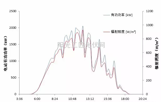 對于發(fā)電量模擬,首先是環(huán)境變量的采集和輸入。通過采集光伏電站的傳感器、匯流箱、逆變器等實測環(huán)境變量可以更精準了解到電站的運行情況。如圖所示的電站實測總輻照曲線和當日實測發(fā)電量峰谷有很精準的擬合度,這就給故障診斷提供了依據(jù)。其次是模型算法,結合組件、逆變器、變壓器等模型可以生成電站的發(fā)電量模型,將相應的環(huán)境變量輸入相應的電站模型當中,可以得到在考慮了已知環(huán)境因素下的理想發(fā)電量。數(shù)據(jù)量豐富的公司會使用自己的通過大數(shù)據(jù)修正過的模型,從而減少誤差。
