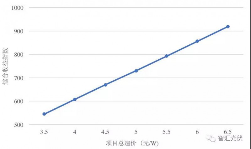 當(dāng)初始投資為4元/W時(shí),綜合收益指數(shù)(發(fā)電小時(shí)數(shù)×上網(wǎng)電價(jià))達(dá)到610時(shí),項(xiàng)目內(nèi)部收益率即可達(dá)到基準(zhǔn)收益率8%。