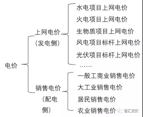 在探討平價(jià)上網(wǎng)路徑時(shí),首先要確定平價(jià)上網(wǎng)中的“價(jià)”是多少。我國現(xiàn)有的電價(jià)分類如下圖所示。