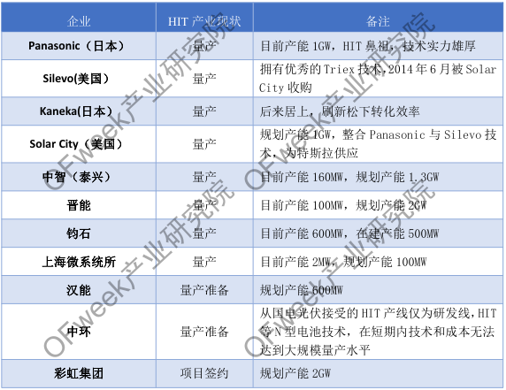 OFweek產(chǎn)業(yè)研究院數(shù)據(jù)顯示,在大規(guī)模量產(chǎn)方面,首屈一指的當(dāng)然是日本三洋,現(xiàn)有產(chǎn)能1GW,量產(chǎn)效率達(dá)23%。除此之外,有較成熟HIT技術(shù)的還有Keneka、Sunpreme、Solarcity、福建均石、晉能、中智(泰興)、漢能等企業(yè)。