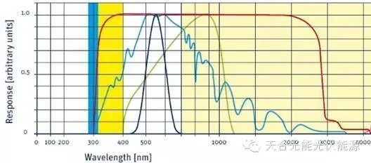 (藍(lán)色:太陽(yáng)輻射光譜 綠色:晶硅電池片的光譜響應(yīng) 紅色:熱電表的光譜響應(yīng))
