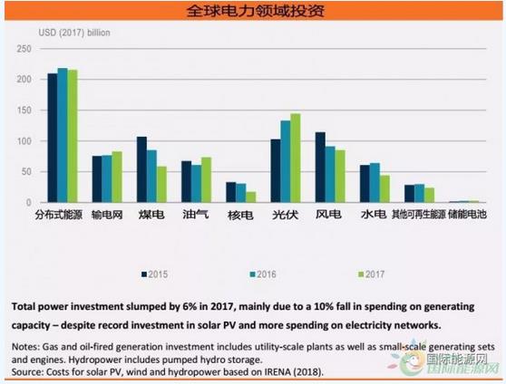7月17日,國際可再生能源署發(fā)布《2018年全球能源投資報告》,《報告》數(shù)據(jù)顯示,2017年全球能源投資總額達1 8萬億美元,與2016年相比,實際下降2%,主要原因是化石燃料支出停滯,煤炭、水電和核電廠產(chǎn)能減少。