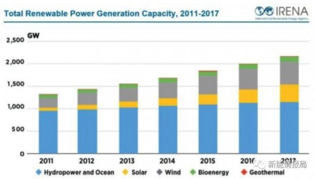 圖四:TotalRenewable Power Generation Capacity, 2011-2017 數(shù)據(jù)來源:IRENA