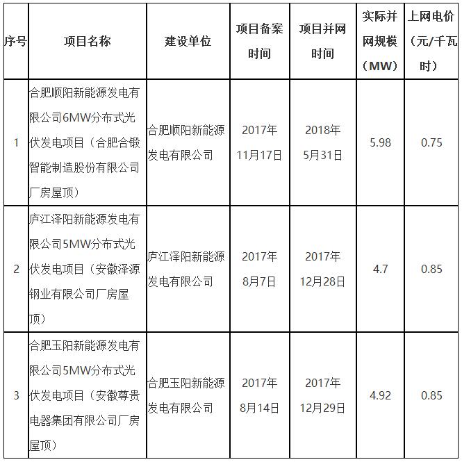 根據(jù)《國家發(fā)展改革委國家能源局關(guān)于完善光伏發(fā)電規(guī)模管理和實(shí)行競(jìng)爭(zhēng)方式配置項(xiàng)目的指導(dǎo)意見》(發(fā)改能源〔2016〕1163號(hào))、《國家發(fā)展改革委關(guān)于調(diào)整光伏發(fā)電陸上風(fēng)電標(biāo)桿上網(wǎng)電價(jià)的通知》(發(fā)改價(jià)格〔2016〕2729號(hào))和《國家發(fā)展改革委關(guān)于2018年光伏發(fā)電項(xiàng)目?jī)r(jià)格政策的通知》(發(fā)改價(jià)格規(guī)〔2017〕2196號(hào))等相關(guān)規(guī)定,同意合肥順陽新能源發(fā)電有限公司等3家企業(yè)3個(gè)發(fā)電項(xiàng)目(具體項(xiàng)目名單見附件)自并網(wǎng)發(fā)電之日起,執(zhí)行相應(yīng)的上網(wǎng)標(biāo)桿電價(jià)。上網(wǎng)電價(jià)與電網(wǎng)公司結(jié)算部分按我省燃煤機(jī)組標(biāo)桿上網(wǎng)電價(jià)(含脫硫、脫硝、除塵加價(jià))執(zhí)行,可再生能源補(bǔ)貼待納入國家可再生能源補(bǔ)貼目錄后再行結(jié)算。