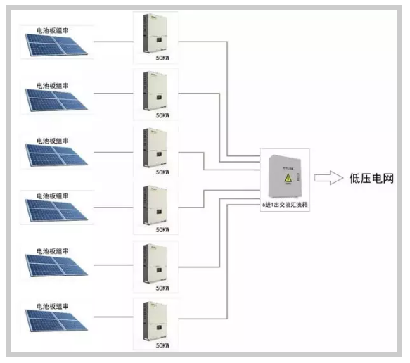 針對300KW村級扶貧電站的設計方案,各逆變器廠家紛紛推出輸出電壓380V/400V的產(chǎn)品。目前大多數(shù)逆變器廠家具有直流輸入1100V,交流輸出380V/400V的50KW和60KW組串式逆變器,可選性比較多,目前市場上通常有兩種傳統(tǒng)典型的設計方案,第一種方案以50KW組串式逆變器展開,第二種方案則以60KW組串式逆變器展開。這兩種設計方案整體來說,占地面積較大,建設成本較高,適合資金相對充裕的村級光伏電站,對于村級扶貧光伏電站來說,降低建站成本、提高電站品質才是迫切需求,因此,300KW村級扶貧電站的設計勢必有優(yōu)選的方案所代替。