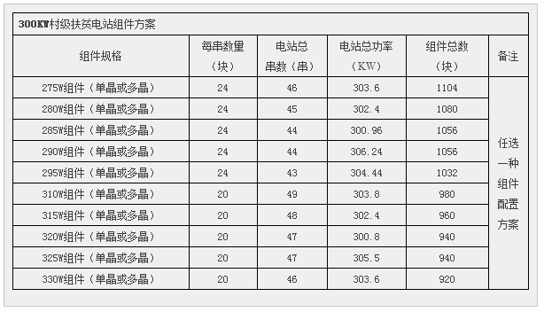 300KW村級扶貧電站采用300KW扶貧專用逆變器方案,只需要1臺扶貧專用逆變器。假設選用315W的組件,建議使用20塊組件為一串,共需要48串,電站組件總功率為302.4KW。