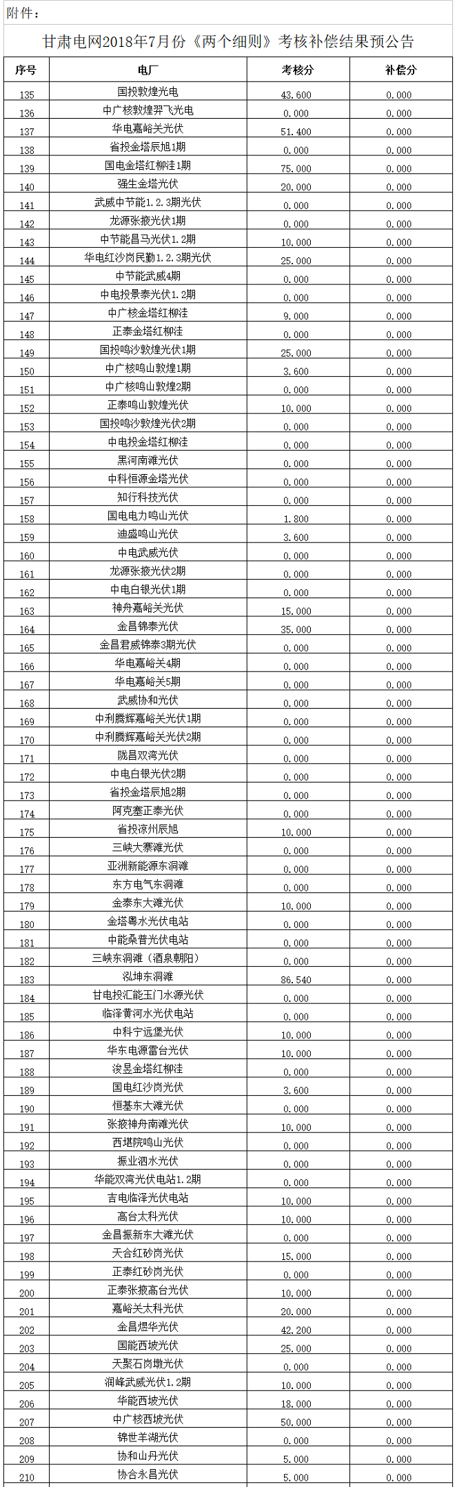 附件:甘肅電網(wǎng)2018年7月份“兩個細(xì)則”考核補償結(jié)果預(yù)公告