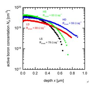 背面N+的形成可以有熱擴(kuò)散的形式也可以用離子注入的形式。若是使用熱擴(kuò)散的方式,則工藝過程中要用到掩膜工藝,增加了工藝的成本及復(fù)雜性。離子注入是一種能夠單面摻雜且均勻性很好的半導(dǎo)體制造工藝,通過調(diào)節(jié)注入?yún)?shù)和配套的退火工藝可以達(dá)到所需要設(shè)計(jì)的結(jié)形及結(jié)深,而且可以省去去磷/硼硅玻璃(P/BSG)步驟,簡(jiǎn)化了制造工藝。如圖7所示為四種不同工藝下發(fā)射結(jié)的濃度分布情況[6]: