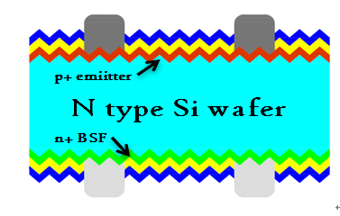 nPERT雙面電池基本工藝流程為:(1)雙面制絨(2)上表面擴(kuò)散硼制成P+N結(jié)(3)背面擴(kuò)散磷制成N+N結(jié)(4)雙面鈍化薄膜(5)雙面金屬化