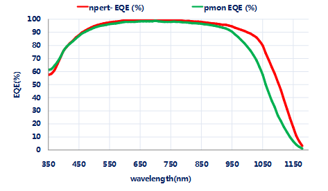 通過EQE測(cè)試結(jié)果可知(如圖2),相比于P型常規(guī)電池,nPERT電池具有更好的長波響應(yīng),可將更多長波長的光吸收,尤其是制備成雙玻組件后背面可更高效率的吸收反射光和散射光。