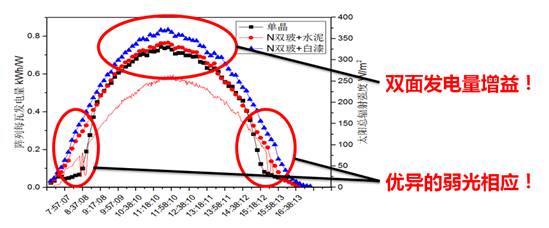 由于nPERT電池本身具有長波響應(yīng)好的特點(diǎn),結(jié)合雙玻組件雙面受光條件,可在早晨和傍晚實(shí)現(xiàn)發(fā)電量的增益,下圖為三組光伏陣列單日的發(fā)電量跟蹤曲線,將nPERT雙玻組件在兩種不同反射條件下與常規(guī)P型單晶進(jìn)行比較,可見在早晚兩個(gè)時(shí)段,nPERT雙玻組件有更好的弱光發(fā)電量保證。