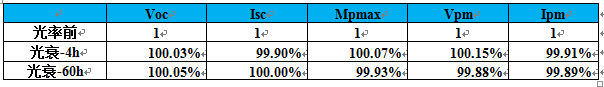 nPERT雙面電池采用N型硅作襯底,具有少子壽命高、無光致衰減等優(yōu)點(diǎn)。常規(guī)P型電池由于使用硼摻雜的硅襯底,長時(shí)間光照后易形成硼氧鍵,在基體中捕獲電子形成復(fù)合中心,導(dǎo)致3~4%的功率衰減;而nPERT電池使用N型硅襯底,磷摻雜的基體使得電池幾乎無光致衰減。我們對(duì)nPERT電池進(jìn)行了光衰實(shí)驗(yàn)驗(yàn)證,如表1結(jié)果所示,光照60h后效率衰減僅0.11%,無光致衰減的特點(diǎn)能有效保證系統(tǒng)端的功率輸出和發(fā)電量。