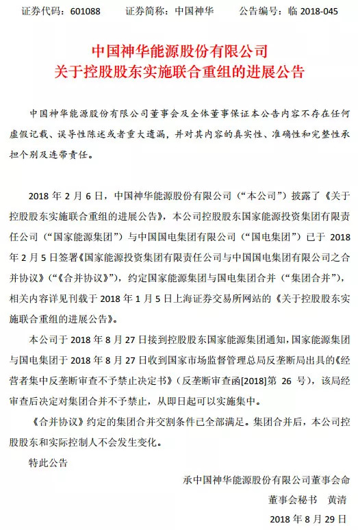 8月29日,中國神華、國電電力均發(fā)布公告稱,國家能源集團(tuán)和國電集團(tuán)此前在合并協(xié)議中約定的集團(tuán)合并交割條件,已全部滿足。