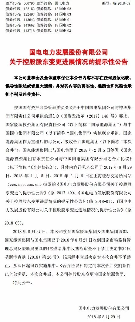 合并后,中國神華控股股東和實(shí)際控制人不會發(fā)生變化。國電電力控股股東變更為國家能源集團(tuán)。根據(jù)此前的公告,國家能源集團(tuán)因此次重組,承繼取得國電集團(tuán)直接及間接持有國電電力46.09%的股份。
